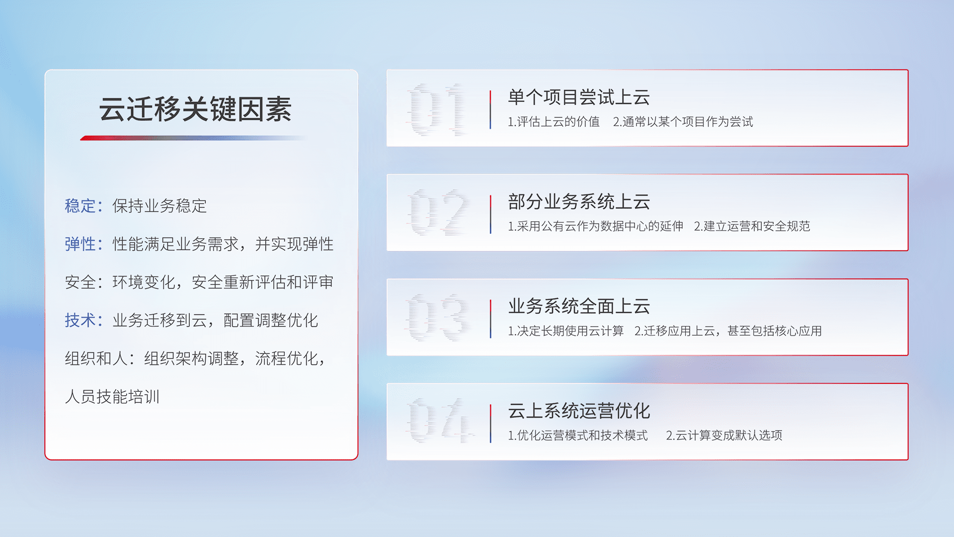 结合实际业务,,从规划设计、、云平台选型、、、云原生改造、、、、数据迁移、、集成交付,,迁移全过程为客户识别最佳上云路径,,做好风险识别管理,,,设计网络架构、、、身份权限、、安全审计合规、、、、操作审计、、、日志审计、、、监控告警策略、、、、多站点容灾设计等,,对云上基础设施进行整体规划,,提升IT治理水平,,以满足弹性、、高可用、、、高性能的需求。。